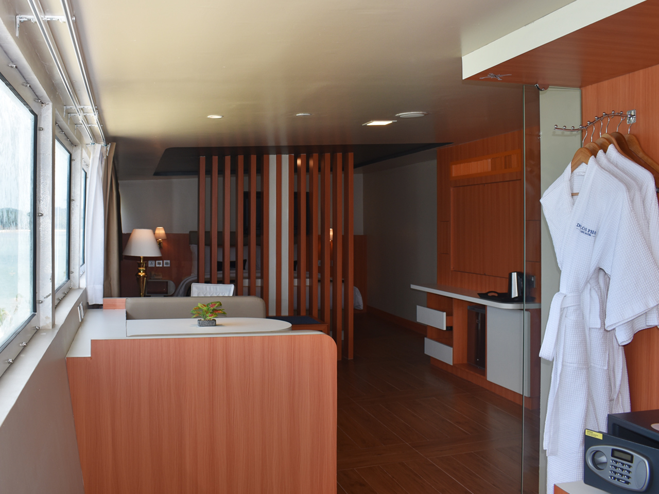 In-Cabin Amenities: Television, digital safe, bar fridge, mineral water, coffee & tea, open wardrobe, bathrobe, cabin slippers, essential toiletries.